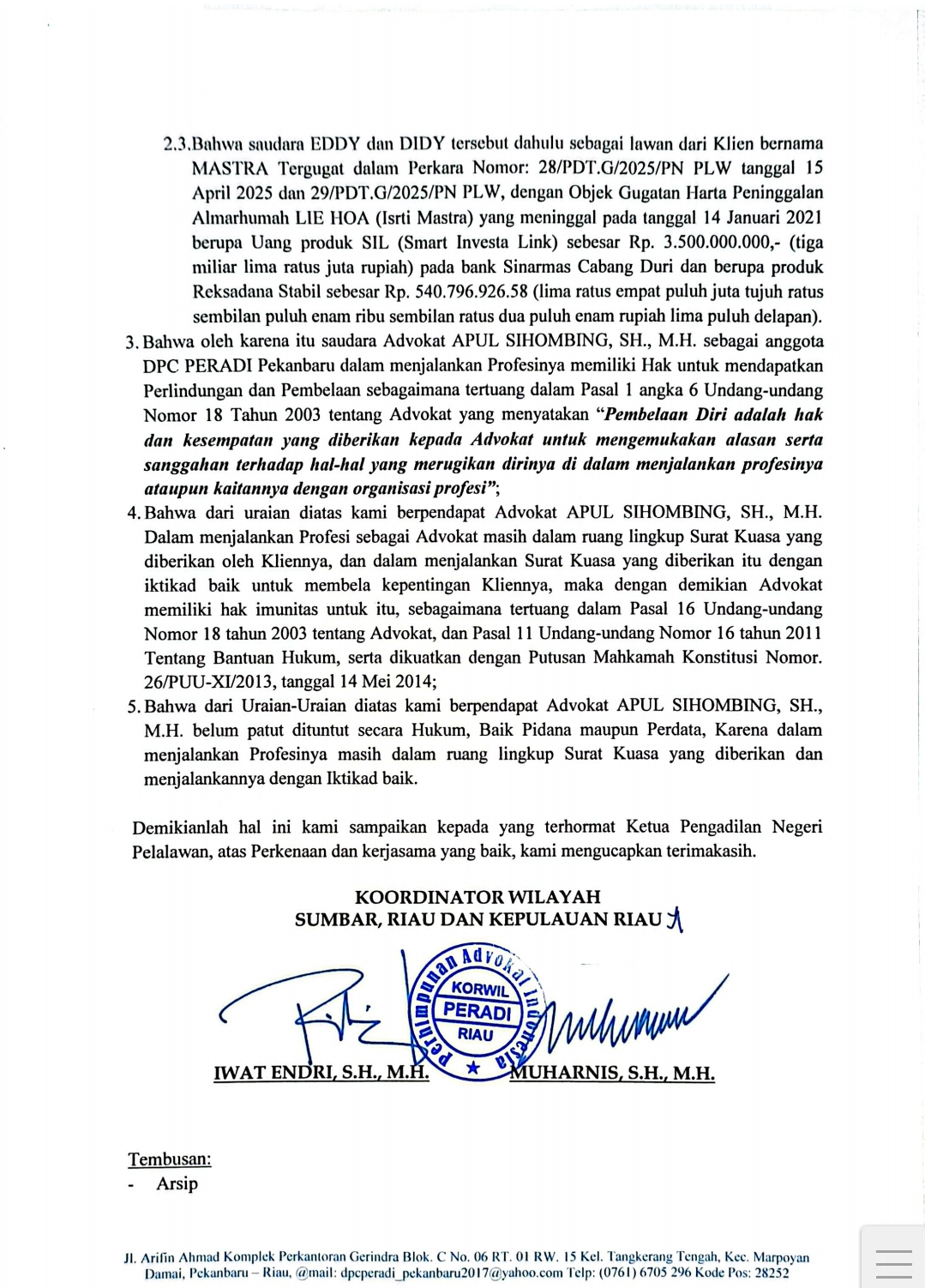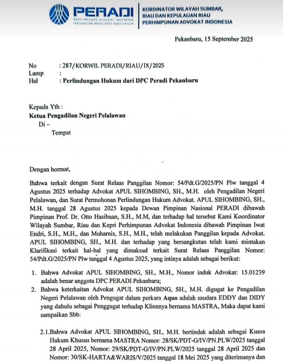 ‎Atas gugatan tersebut, Apul kemudian meminta perlindungan hukum kepada DPN Peradi. Permintaan itu mendapat respon positif. DPN Peradi mengeluarkan surat resmi Nomor 287/KORWIL PERADI/RIAU/IX/2025, yang ditujukan kepada Ketua Pengadilan Negeri Pelalawan dengan tembusan kepada Apul.