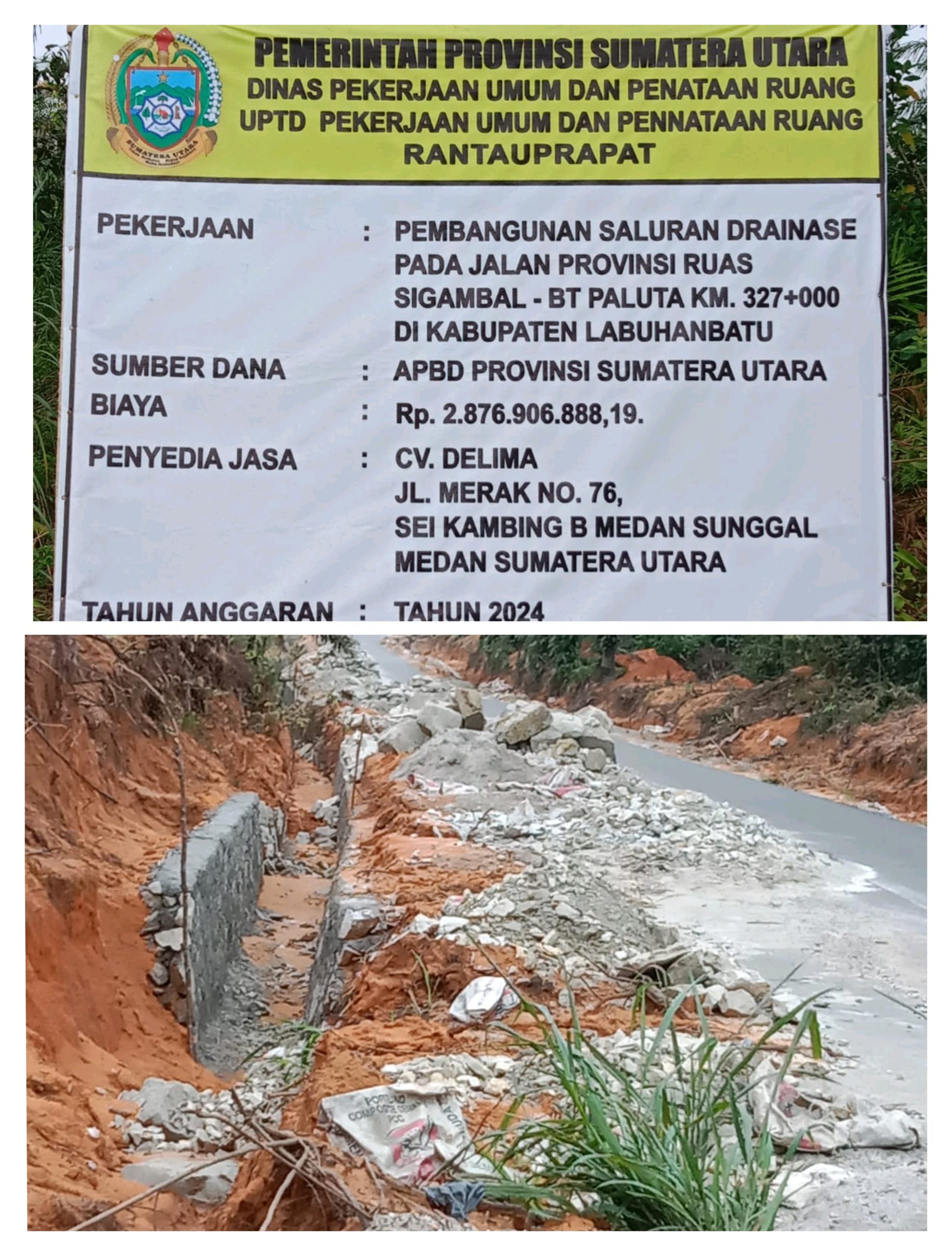 Proyek pembangunan drainase di ruas Jalan Provinsi Sumatera Utara, Sigambal-BT Paluta KM 327+000, Kabupaten Labuhanbatu, senilai Rp2,87 miliar dari APBD Sumut 2024, menuai sorotan tajam. Meski pembayaran disebut telah lunas pada Desember 2024, progres fisik proyek yang dikerjakan CV Delima ini baru mencapai sekitar 60-70% hingga 7 Januari 2025.