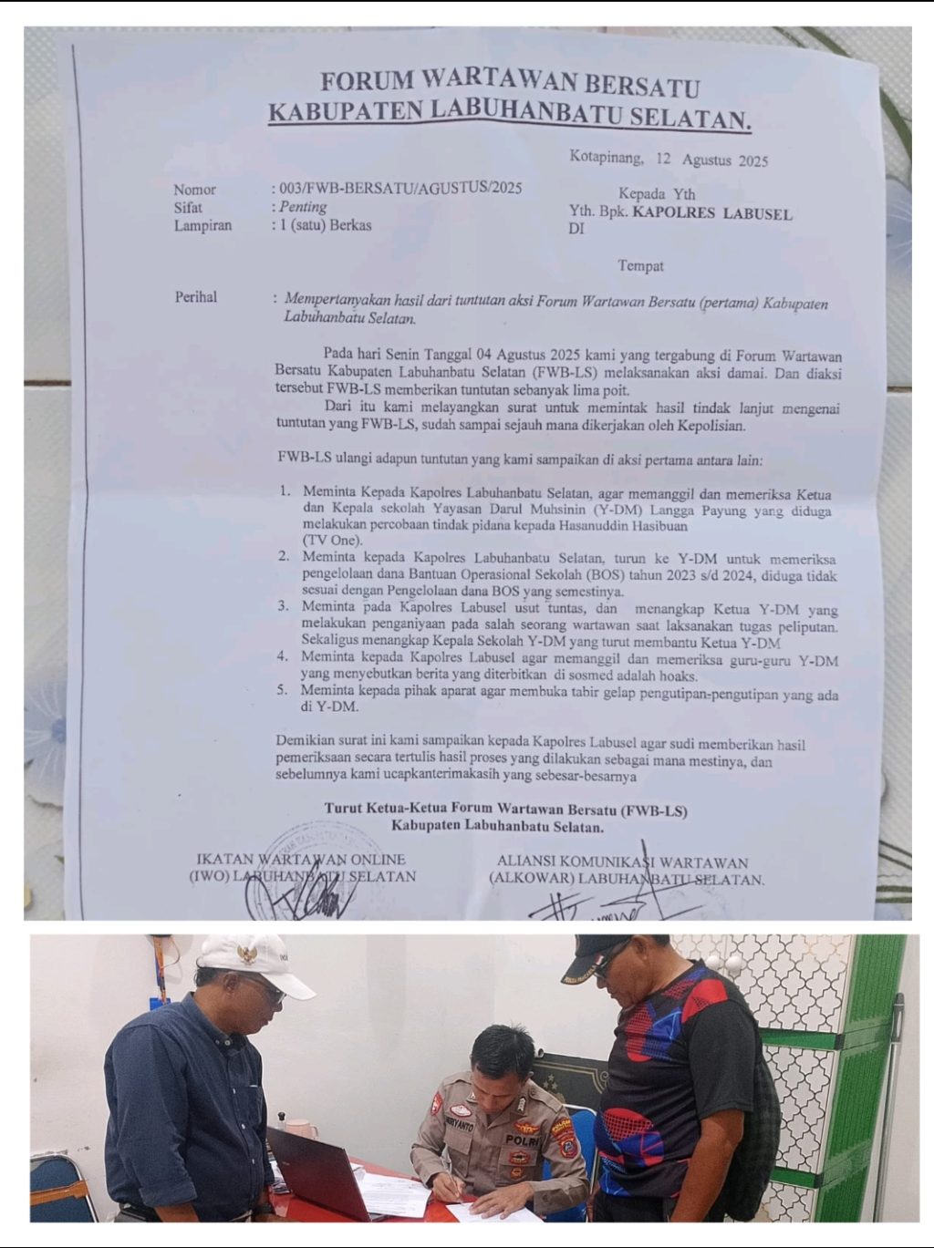 Forum Wartawan Bersatu Labuhanbatu Selatan (FWB-LS) resmi melayangkan surat kepada Polres Labuhanbatu Selatan untuk mempertanyakan tindak lanjut atas tuntutan mereka, khususnya terkait dugaan intimidasi yang diduga dilakukan oleh oknum Kepala Y.D.M. di Kecamatan Sungai Kanan, Kabupaten Labuhanbatu Selatan, Sumatera Utara.
