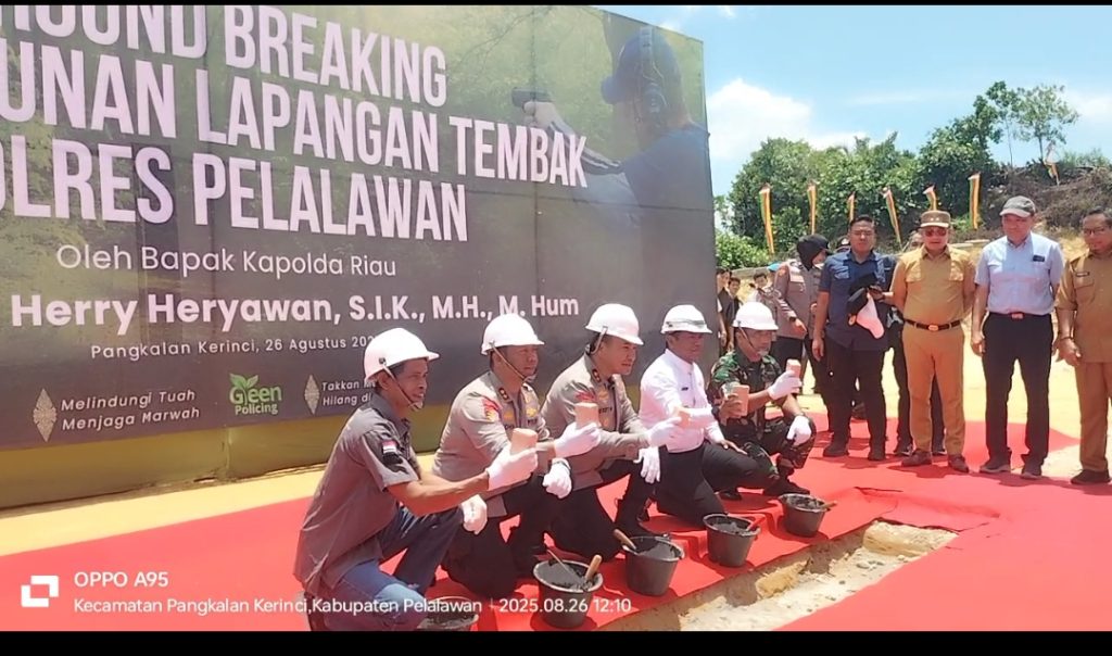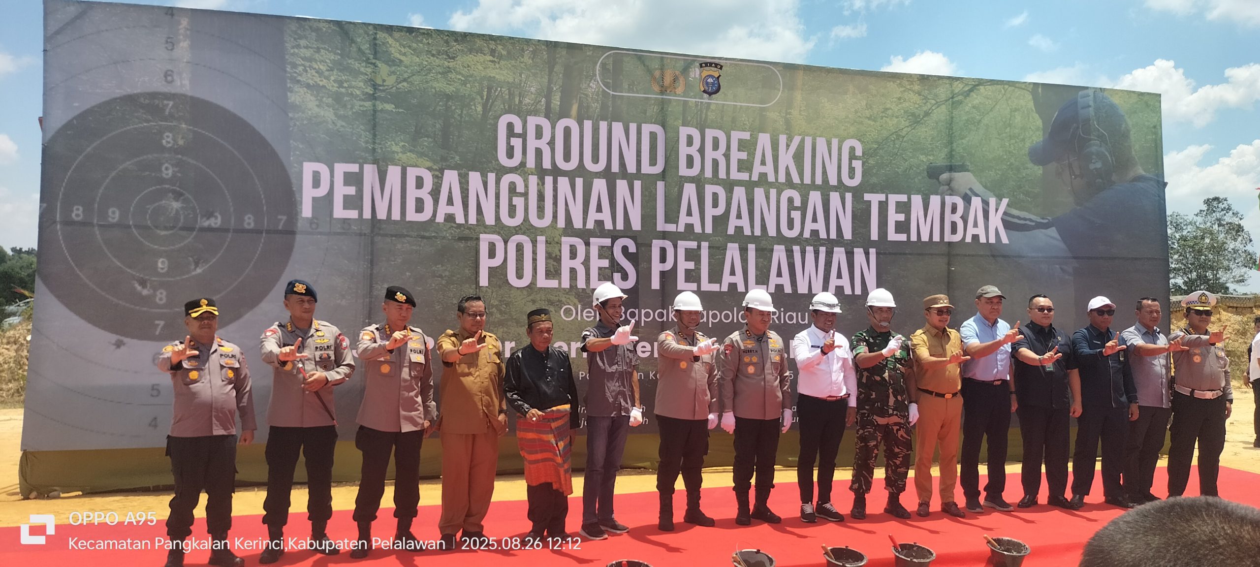 Kapolda Riau Irjen., Pol,. Dr. Herry Heryawan.,S.IK.,M.H., M.Hum didampingi Bupati Pelalawan H. Zukri.,SM.,MM, melakukan peletakan batu pertama Ground Breaking Pembangunan Lapangan Tembak Polres Pelalawan. Kegiatan berlangsung di area pembangunan lapangan tembak Polres Pelalawan, Selasa (26/8/2025).
