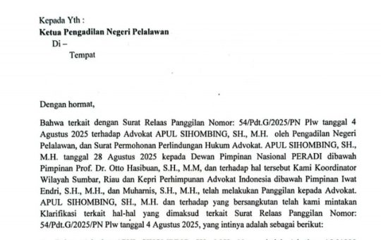 PEKANBARU, – suarafaktual.com Dewan Pimpinan Nasional (DPN) Perhimpunan Advokat Indonesia (Peradi) menegaskan bahwa Advokat Apul Sihombing, SH MH telah...